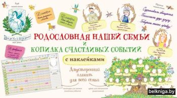 Большой двусторонний плакат с наклейками.- Тёплое общение всех поколений и полезный творческий досуг.- Готовый шаблон для самостоятельного проекта в детский сад или школу.- Важный и нужный подарок для каждой семьи.Одна сторона. Семейное древо.Создайте вместе родословное древо семьи – расскажите ребёнку о его предках – прабабушках и прадедушках, кем они работали, кем были их родители, вспомните вместе всех близких вам родственников, а малыш запишет их имена на веточках древа и нарисует семейные портреты.Вторая сторона. Календарь счастливых дней.Отмечайте в календаре значимые счастливые даты вашей семьи – семейные праздники, дни рождения родных и друзей, дни свадьбы, новоселье. Записывайте даже маленькие личные, но полные радости события – первый звонок, день похода всей семьёй в театр или на концерт, день сдачи экзаменов – маленькие победы и радости членов вашей семьи!